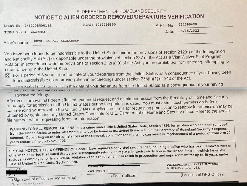 In the deportation document called “Notice to Alien Ordered Removed”, it states that Don was found to be “inadmissible to the United States under the provisions of section 212(a) of the Immigration and Nationality Act… in proceedings under section 235(b)(1)”.